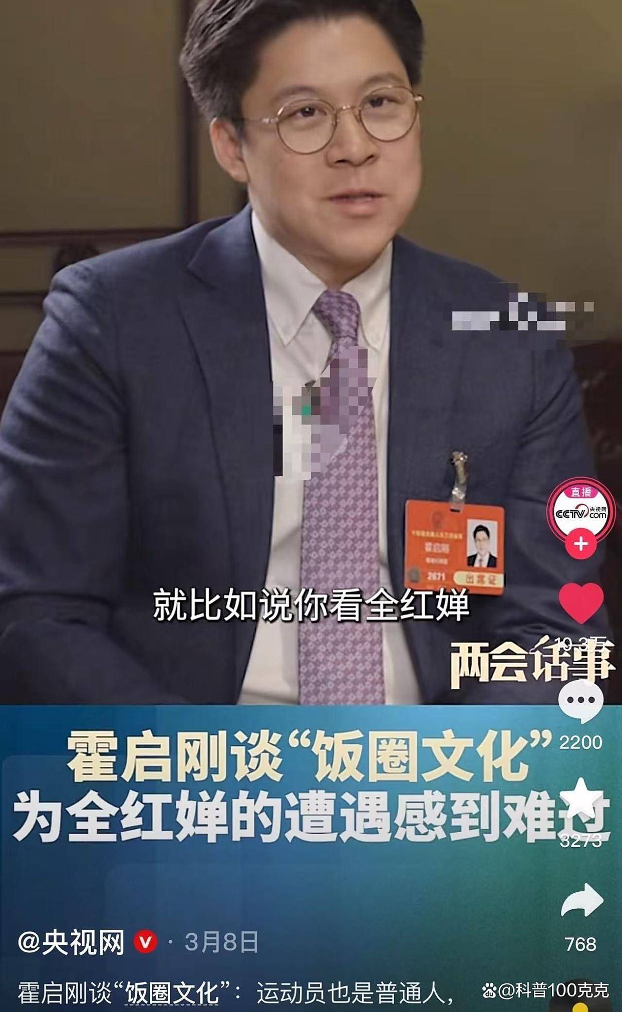 这种乱象连郭晶晶的丈夫霍启刚都难以容忍,他公开为全红婵鸣不平,用“痛心疾首”形容体育饭圈化的危害。
